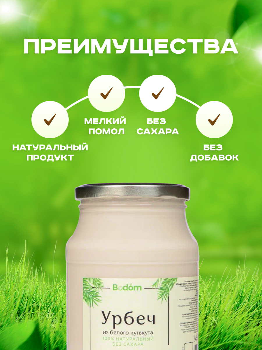Урбеч из белого кунжута от компании Bodom Store. 100% натуральный, без трансжиров и консервантов. Изготовлен в России на собственном производстве бренда Bodom из свежих семян, перетирая их при помощи специального приспособления – каменных жерновов. Никакой термической обработки, добавления усилителей вкуса и прочих пищевых дополнений для приготовления урбеча не используется. Вследствие натуральности продукта возможно выделение масла. Семена белого кунжута - это продукт с обширным перечнем благоприятного воздействия на организм. Он имеет высокое содержание кальция, за счет этого улучшается состояние ногтей, укрепляются кости и суставы. Кунжутное семя отлично укрепляет иммунитет, ускоряет метаболизм, благотворно влияет на пищеварение и обменные процессы в организме. Паста из белого кунжута обладает терпким, сочным вкусом и изысканным ароматом. Урбкч можно использовать как вкусная и полезная замена сливочного масла; добавлять в салаты или в различные блюда. Товары и их упаковка могут отличаться от представленных на изображениях, как по форме так и по дизайну, цветовой гамме, контрасту, размерам упаковки, обозначениям на товаре или упаковке, в зависимости от новой поставленной производителем партии сырья. При этом, заявленный состав, действующие вещества, свойства и характеристики остаются неизменными. Кроме того, вы можете купить различные вкусы урбеча в различных объемах, для этого переходите в наш магазин. Продукт может содержать следы арахиса или других орехов. Также относится: без глютена, полезные сладости, пп вкусняшки, диабетические продукты, полезно для печени и поджелудочной, улучшает кровообращение и артериальное давление, еда для похудения, для диабетиков, здоровое питание, перекус, десерт, для кофе, постный продукт, употребляют с медом и намазывают на хлеб со сливочным маслом.
