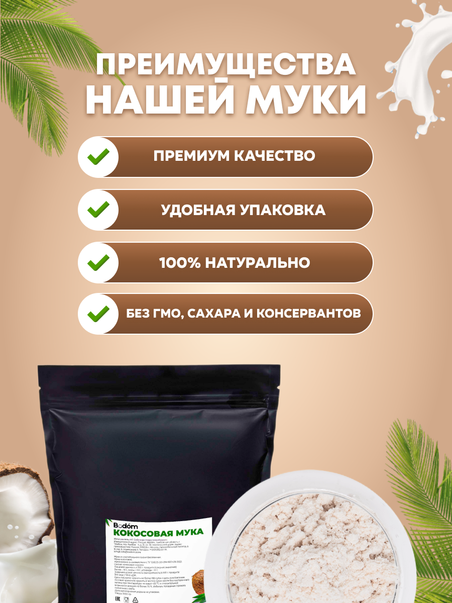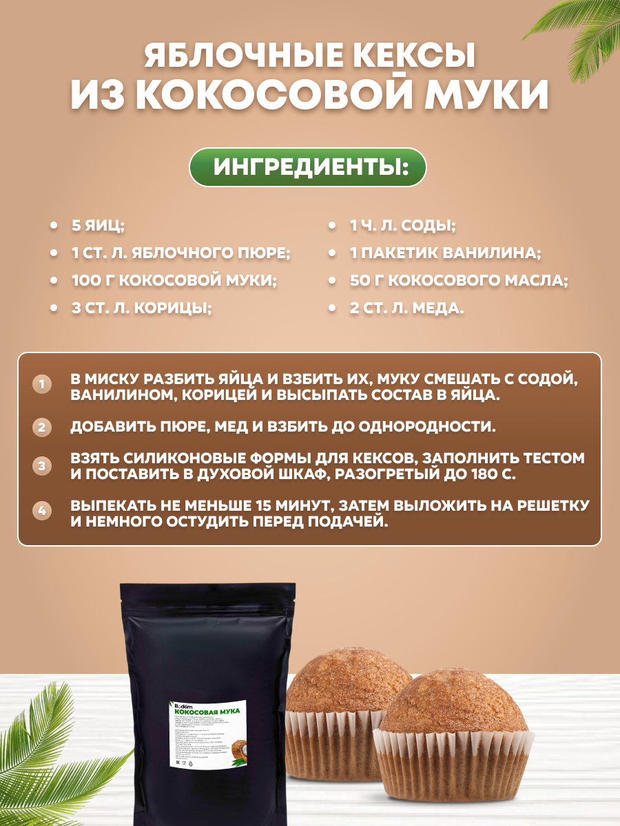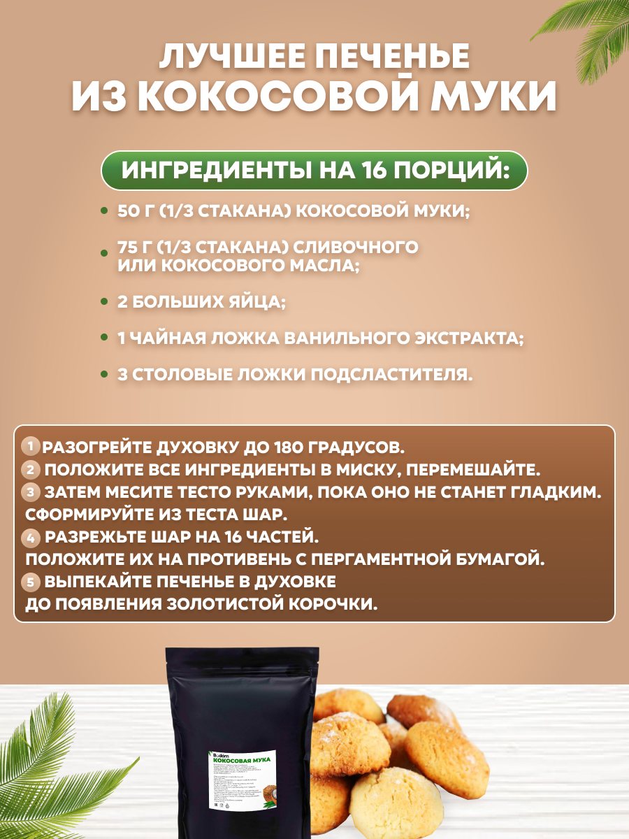 Мука кокосовая, 100% натуральная, без глютена. Изготовлено в России на собственном производстве бренда Bodom. Мука из мякоти кокоса станет хорошим дополнением для ваших рецептов: ее добавляют в блины, блинчики, хлеб, печенье, сырники, оладьи, кексы и в другие рецепты выпечки. Из нюансов: тесто нужно тщательно перемешивать, чтобы не было комочков. Популярна она и при ПП (правильное питание), а также в кето-диете, потому что это безглютеновая и беззерновая альтернатива пшеничной муке. Ее употребление полезно для кожи и волос, блюда из нее имеют пользу при болезнях желудочно-кишечного тракта и кровеносной системы. Продукт запакован в плотный непрозрачный пластиковый пакет, также имеет дополнительный упаковочный материал для большей надежности при доставке. Упаковка может отличаться от той, что на фотографии. Также относится к нашему продукту: низкоуглеводная, Органик, 1кг, organic coconut flour, Бодом.